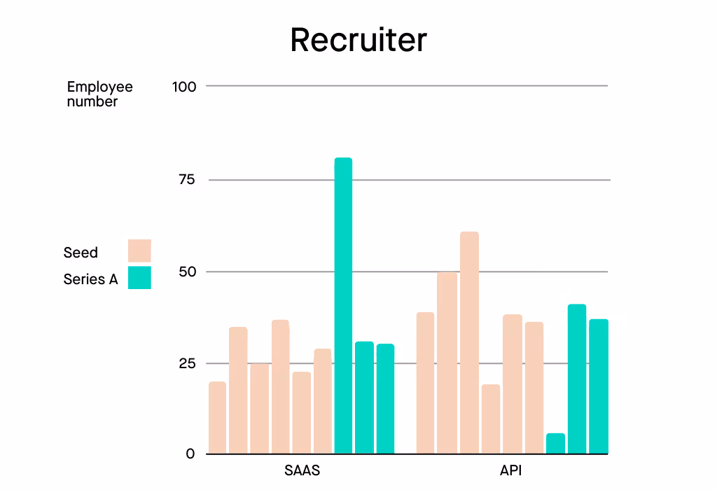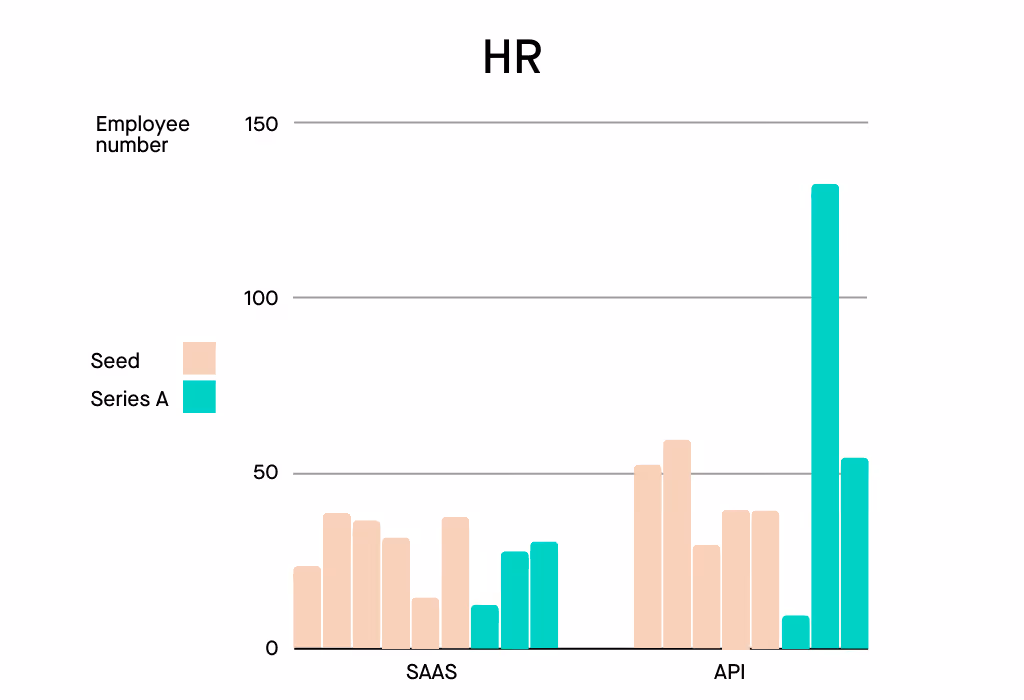 Each bar represents when the role is hired in the business. The series A businesses are in blue and the Seed companies are in grey. I’ve grouped B2B SAAS companies, that’s companies that’s primary product is a web/mobile/desktop business application. And I’ve grouped B2B API companies together, their primary product is an API or infrastructure.