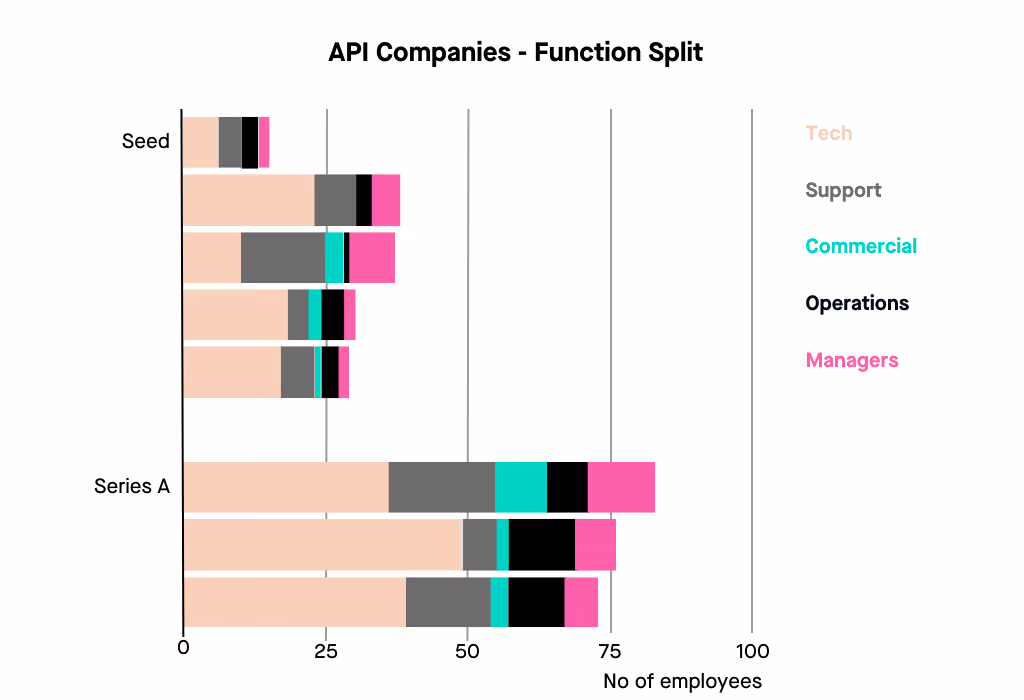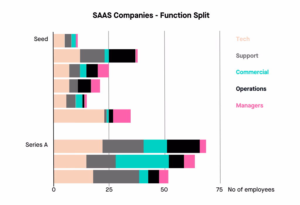 The split is similar across tech, commercial and support roles and in most organisations. The function split is relatively evenly distributed, especially in the ‘successful’ businesses that have done a series A raise.