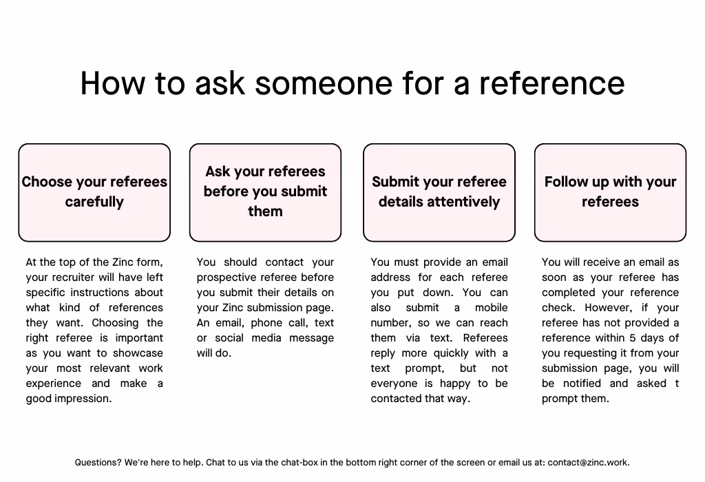 At the top of your Zinc submission page, your recruiter will have left specific instructions about what kind of references they are looking for. You can find all the information you need about the and who to ask for them. Choosing the right referee is important as you want to showcase your most relevant work experience and make a good impression. You also want to think about who will respond promptly to your request, so you can start your new job without delays. Some recruiters expect HR references only so make sure you’ve provided the person to contact.
