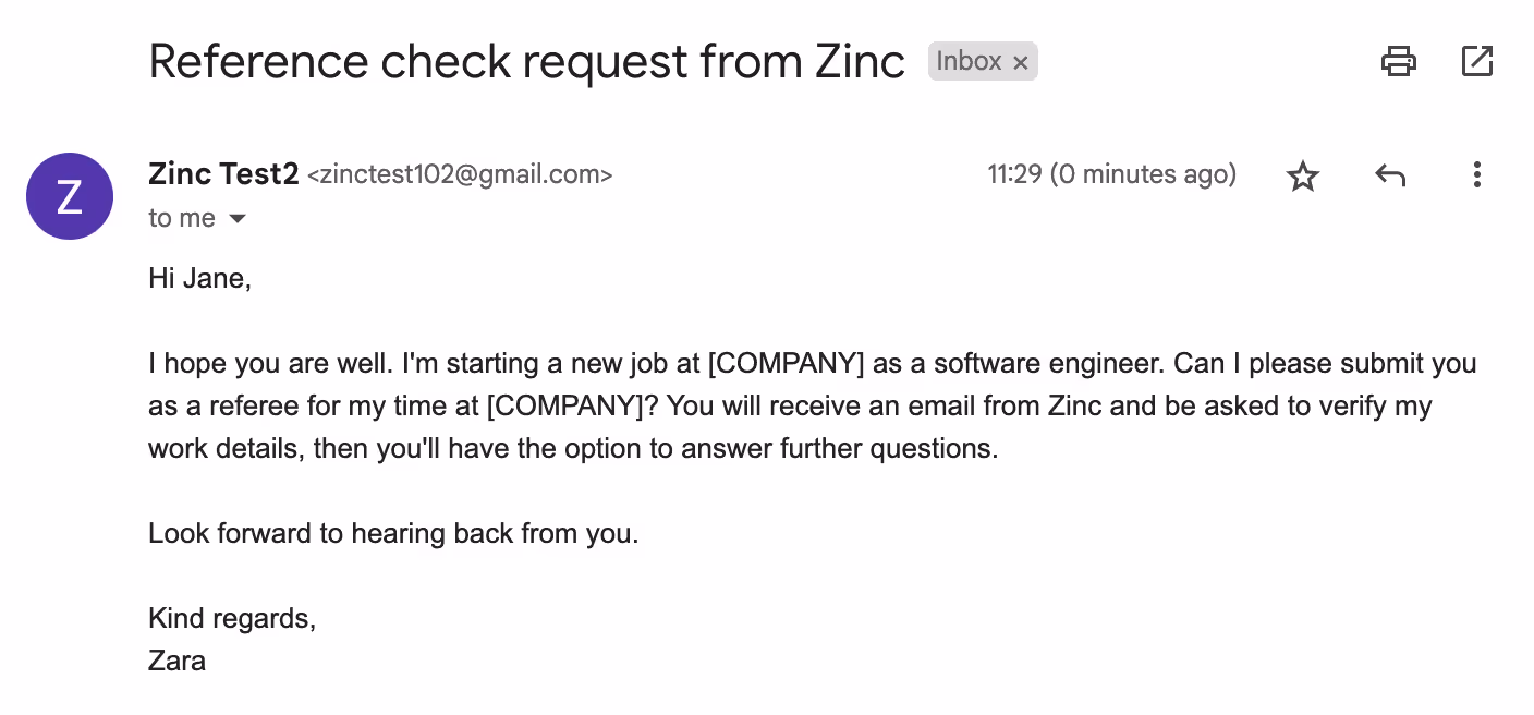 “Hello Jane, it’s Zara. I’m starting a new job at COMPANY as a software engineer. Please can you provide a reference for my time at COMPANY? You will receive an email from Zinc and be asked to verify my work details, then you'll have the option to answer further questions.”