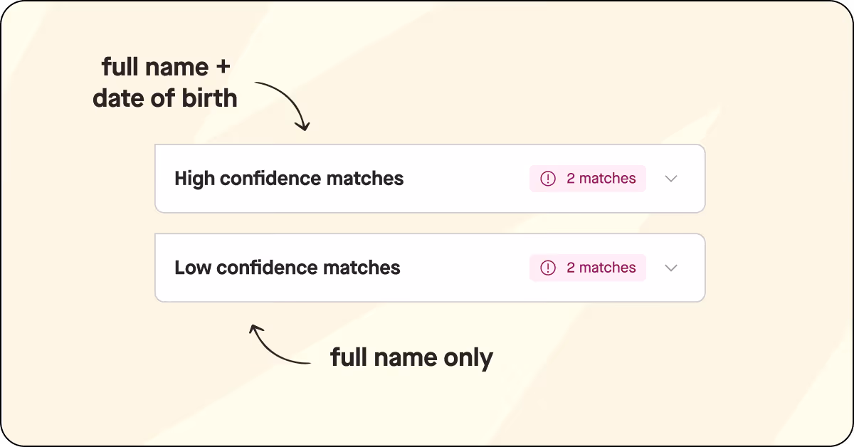 These matches are dual identifier matches, meaning that both the name and date of birth identified are the same as the candidates.