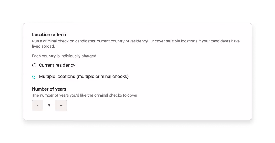 When you toggle on Zinc’s global criminal check product, you can verify criminal history across multiple countries without having to define your candidate’s address history upfront. Zinc will collect the applicant’s address history and direct them to the relevant location’s criminal check process. The platform will verify address history through API connections with global credit agencies, so you don’t have to check the applicant’s address and choose the relevant countries yourself.